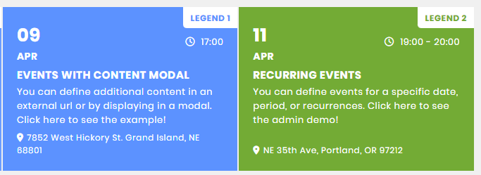- Na home você pode querer utilizar um dos layouts da extensão que é em formato de cards com opção de listar apenas os próximos 5 eventos.